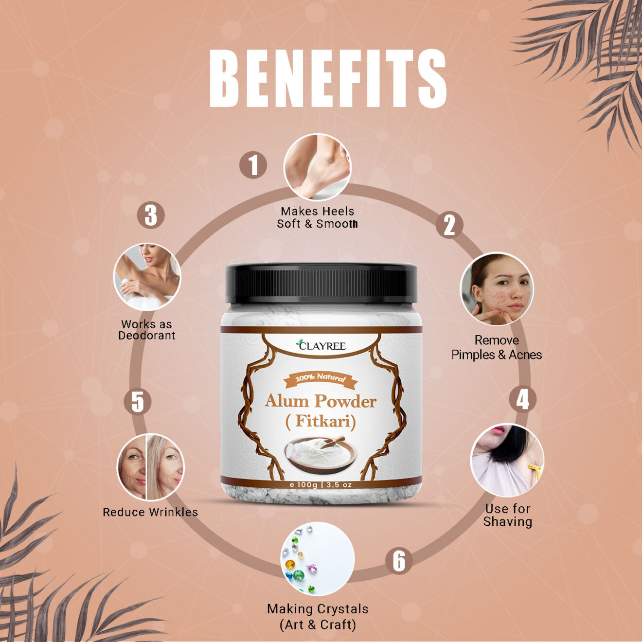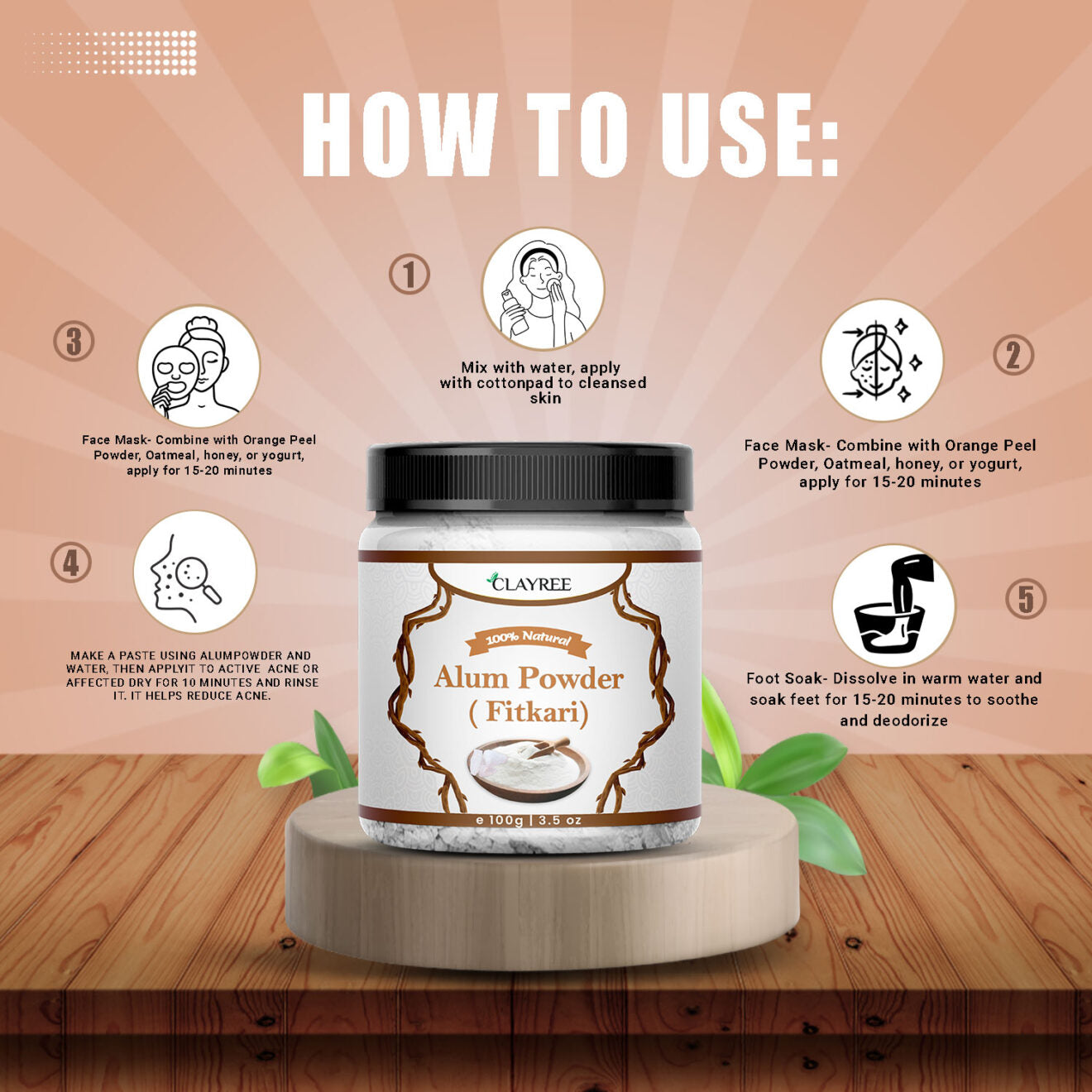 Clayree Alum Powder is a time-tested natural ingredient known for its powerful skin care benefits. Known for its astringent and antibacterial properties, it helps tighten the skin and reduce pores. Alum powder is extremely effective in treating acne and preventing breakouts by controlling excess oil and fighting acne-causing bacteria. It also soothes irritated skin, making it ideal for post-shaving or post-sun care. With regular use, Alum Powder helps tighten skin, reduce fine lines and promote a smoother, fresher skin.