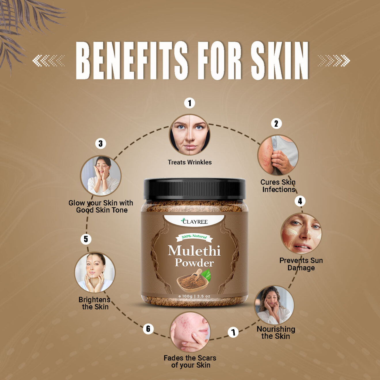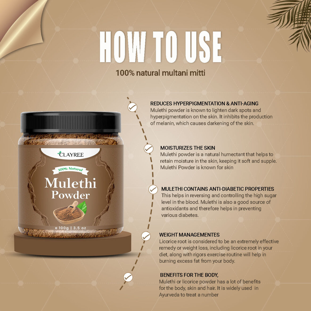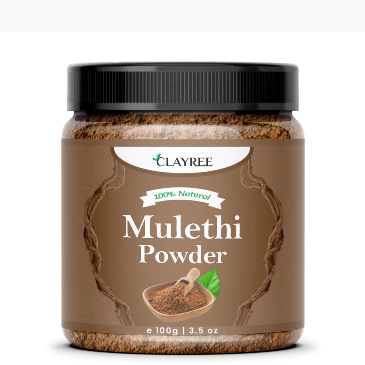 Clayree Mulethi Powder is a powerful natural skin care remedy known for its skin brightening and anti-inflammatory properties. Rich in antioxidants and essential nutrients, this herbal powder helps fade dark spots, reduce tanning, and fight acne-causing bacteria. Regular use evens out skin tone, reduces inflammation and leaves your skin looking clear, youthful and naturally radiant. Ideal for all skin types, Clary Mulethi Powder is a must-have for those seeking healthy, glowing skin, packed with the goodness of Ayurveda.